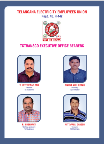 The mission and vision of the Telangana Electricity Employees Union (Regd. No. H-142) is to empower electricity employees and Artisans across Telangana by promoting unity, welfare, safety, and professional growth. We strive to create a fair, inclusive, and progressive work environment that values every employee’s contribution to powering the state’s future.